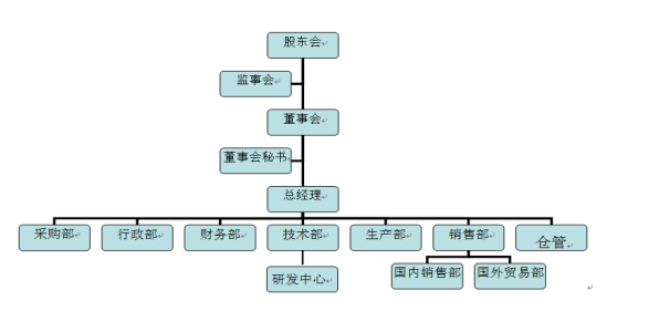 公司根據(jù)業(yè)務流程,設計和建立了組織架構,目前設立了8個職能部門,部門除了各負其責外,部門之間還相互協(xié)調合作,確保管理責任的落實。