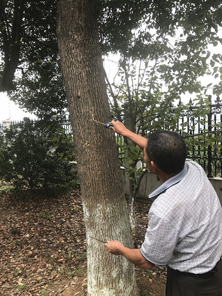 上圖為技術(shù)人員在防治白蟻受災(zāi)處 為全面消除隱患,該所立即組織人員對員工宿舍、綠化帶、辦公樓逐一進(jìn)行地毯式排查,最終發(fā)現(xiàn)三處地方受災(zāi)最為嚴(yán)重,同時在員工宿舍旁綠化帶處找到白蟻窩。該所負(fù)責(zé)人及時聯(lián)系建設(shè)局房管處白蟻防疫站技術(shù)人員,對樹木、門框等進(jìn)行防治消殺和用白粉涂擦等方式排除隱患,通過防治消殺和白粉涂擦等方式,有效確保了所內(nèi)環(huán)境的生態(tài)資源健康和安全。