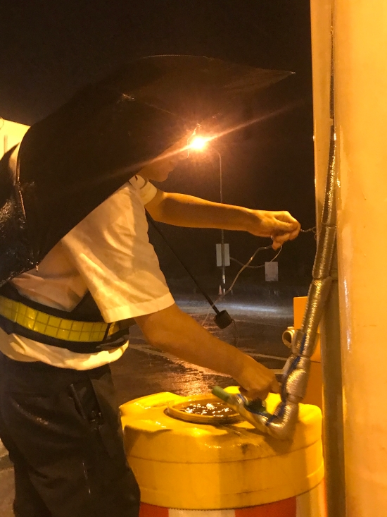 8月9日21點(diǎn)22分,風(fēng)雨越來越大,臨海南收費(fèi)所車道水管被狂風(fēng)吹隨意搖晃,當(dāng)班收費(fèi)員李俊杰不顧狂風(fēng)暴雨,第一時(shí)間拿上鐵絲冒雨捆綁,防止砸到過往車輛,保證了車道安全暢通。