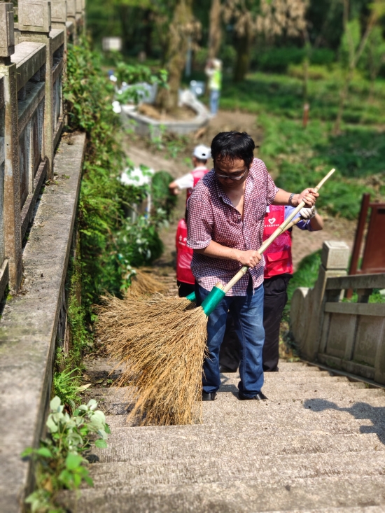 圖為打掃現場 上午8點半左右,志愿者們帶著掃把、鐵鍬等工具到達九峰公園,在黃巖青年志愿者的帶領下,來到劃分的平臺區塊。受9號臺風“利奇馬”影響,公園內不少樹木倒地,枯葉遍地。志愿者們帶著手套,用掃把、鐵鍬將平臺區域內堆積的落葉和樹枝進行裝袋清理。小的樹枝用草繩捆扎;拿不動的樹枝,用鋸子鋸斷了抬走;鐵鍬不好裝袋,就用手去捧。烈日酷暑下,志愿者們不顧汗流浹背,經過兩個多小時的努力,共清理出40多袋垃圾,大家用雙手還公園一片美。