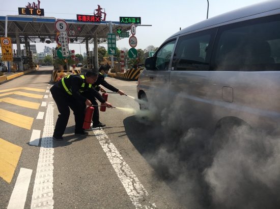圖為交通事故應急演練 在收費廣場交通事故應急預案演練中,該所模擬了汽車在收費車道起火的交通事故。事故發(fā)生后,當班班長第一時間啟動預案,將險情報告監(jiān)控員,并立即關閉事故車道,組織人員對起火點進行前期壓制,同時指揮人員擺放標志,引導后續(xù)車輛,并快速放行。接到險情報告的所長、辦公室人員迅速趕到現場參與救援:女同志協(xié)助班組開足車道;部分男同志負責出入口車輛的疏導指揮工作;其余人員負責對火災進行撲滅……大家各司其職,快速處理險情。