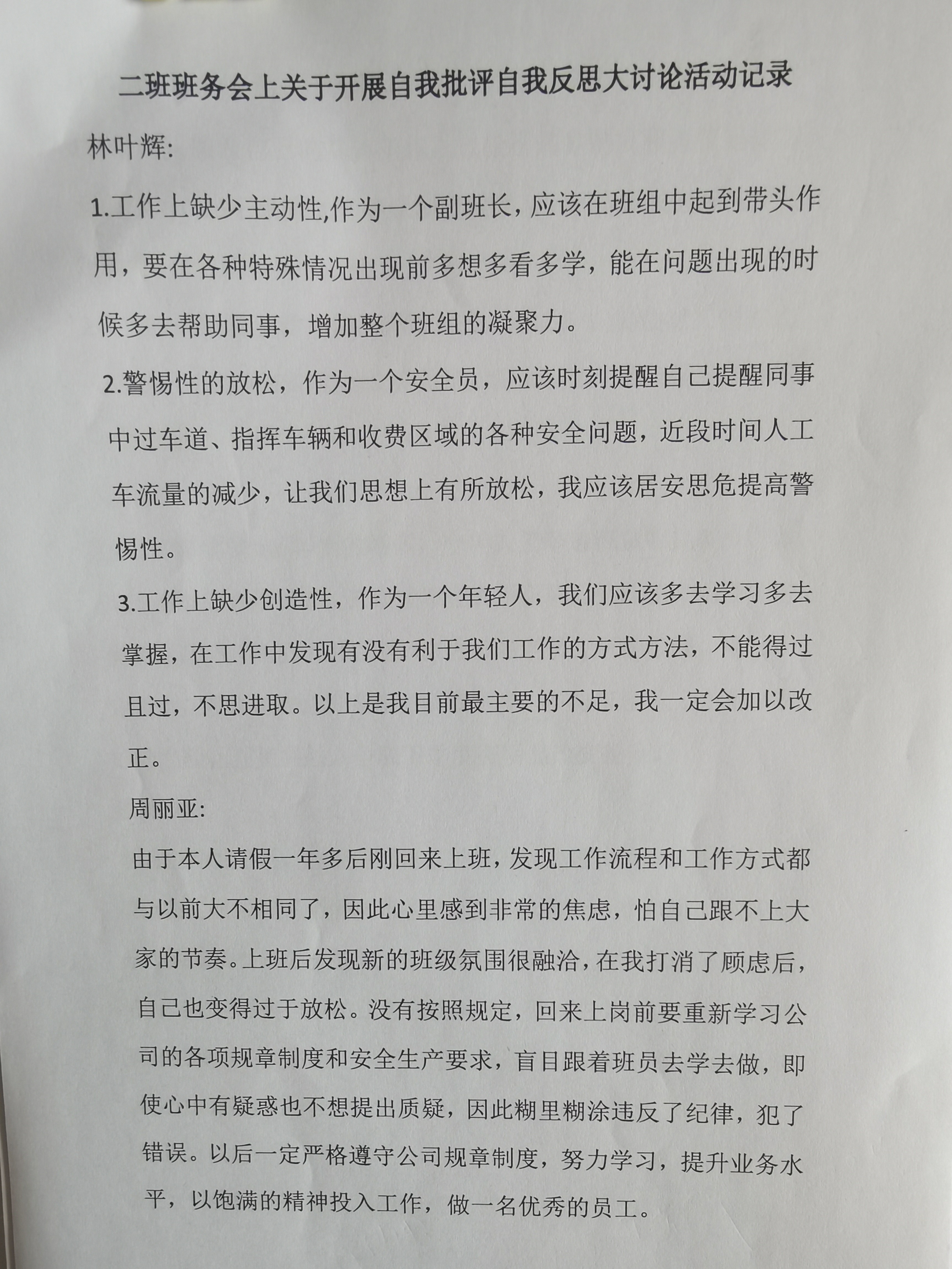 在討論中,大家圍繞自己在思想、學(xué)習(xí)、工作等方面情況,深挖自己的缺點(diǎn)和不足,直面自己的“短”處,并分析原因,拿出解決辦法,然后明確接下去努力的方向。具體問題包括:工作上缺乏主動(dòng)性和創(chuàng)造性,工作態(tài)度情緒化;存在得過且過、不思進(jìn)取的思想;對(duì)自己要求不嚴(yán),遇事強(qiáng)調(diào)客觀理由;隨著車流量的減少,安全警惕性也有所下降等等。