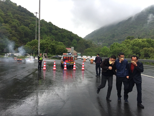 執(zhí)勤隊(duì)緊急出動(dòng),趕赴事故現(xiàn)場(chǎng)。“哎呀,著火啦!”事故車上司乘人員呼喊著:“快!快救火!快救人!”一組人員迅速擺放安全警示牌后,快速有序地將滯留群眾疏散到安全位置,另一組人員利用消防水槍滅火,控制事故車輛火情蔓延,值勤隊(duì)長(zhǎng)根據(jù)現(xiàn)場(chǎng)判斷,果斷地通知中控員開(kāi)啟隧道風(fēng)機(jī)系統(tǒng),對(duì)隧道內(nèi)濃煙進(jìn)行處理,隨后成功撲滅大火。