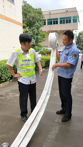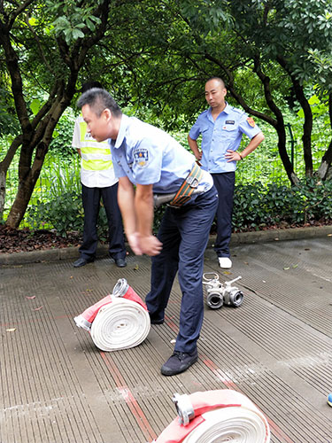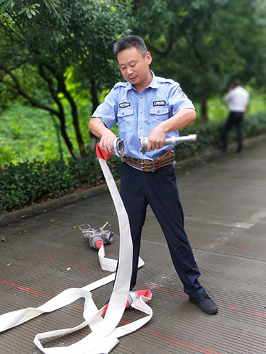 圖為主講人馮常敏操作示范現(xiàn)場 現(xiàn)場,“馮大師”腳下放著兩盤水帶,站姿已成“丁”字步,雙腿微曲,兩拇指與食指握住水帶根部,使虎口以順時針方向?qū)式涌谔?,做好甩開的準備?!八Φ谝槐P水帶,要運用手腕的力量,要提起水帶并高于地面20到30厘米,再用大臂帶動小臂的力量向前甩出?!?“馮大師”耐心地指導(dǎo)。 接下來是兩盤水帶連接的關(guān)鍵時候,“馮大師”左右手熟練操作,將如何連接的操作細節(jié)一一展現(xiàn)出來,同時邊操作邊說明注意事項,整套動作連貫又迅速,操作一氣呵成,一旁的新人仔細觀摩學習。
