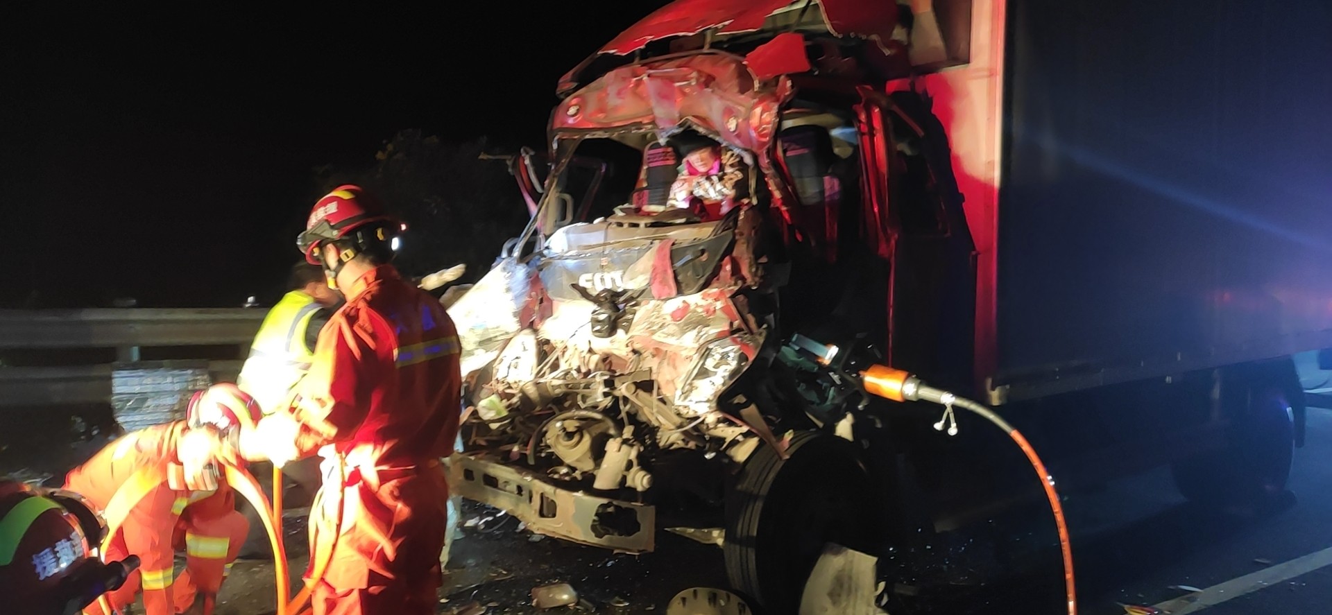 此次事故是貨車(chē)拋錨引起二次追尾,第一輛貨車(chē)拋錨停在慢車(chē)道上,在車(chē)后方設(shè)置了小紅帽,由于天黑車(chē)速快,第二輛貨車(chē)采取了緊急制動(dòng),第三輛避讓不及與前貨車(chē)追尾,造成車(chē)頭嚴(yán)重受損,司機(jī)和司乘人員受傷,而第二輛貨車(chē)卻逃逸了。高速公路上晚上行車(chē)視線不好,貨車(chē)又特別多,車(chē)輛拋錨要“車(chē)靠邊、人撤離、即報(bào)警”,肇事車(chē)未靠邊,引發(fā)后車(chē)相繼追尾,希望司機(jī)朋友們開(kāi)車(chē)時(shí)注意保持車(chē)距,謹(jǐn)遵9字警句,防止疲勞駕駛。 陳旦平