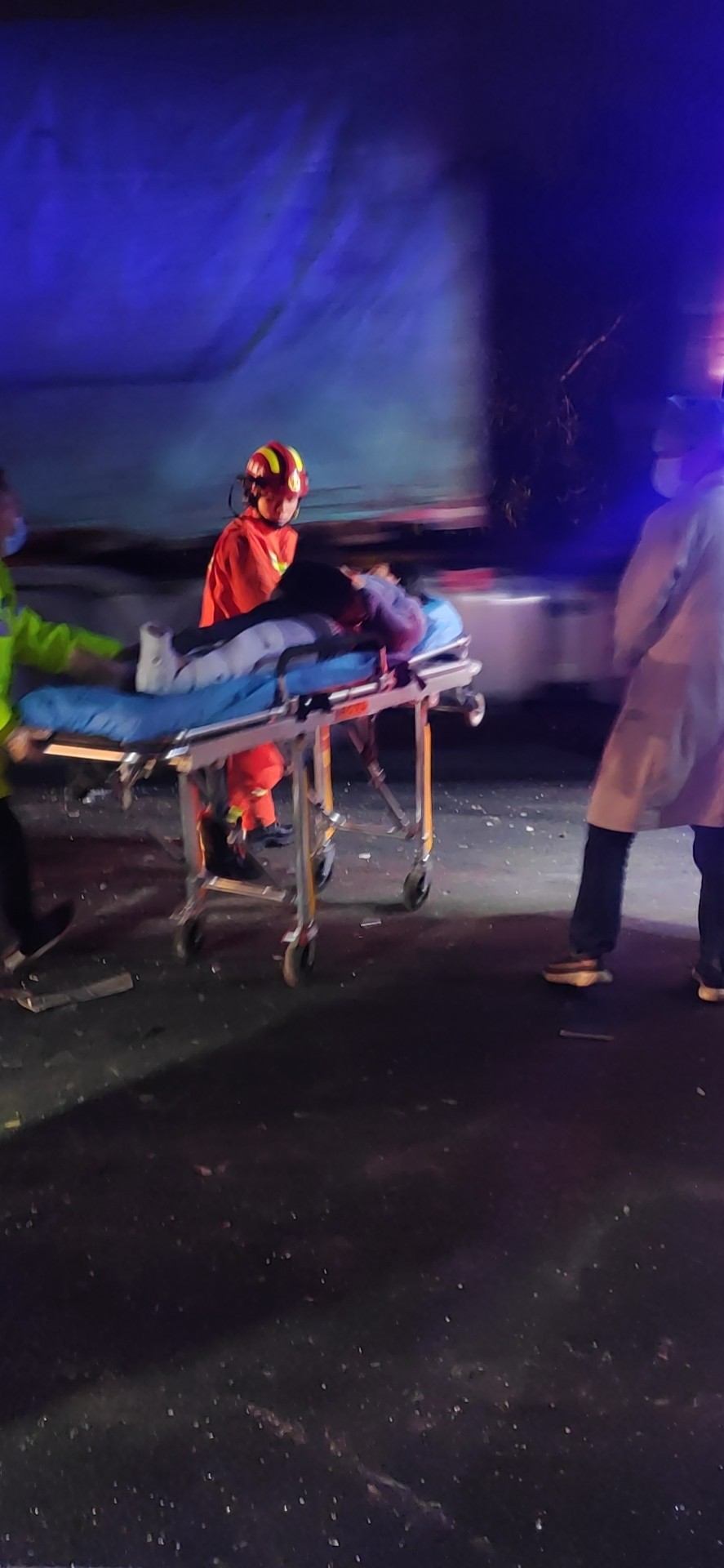 21:50巡邏車(chē)和消防車(chē)同時(shí)到達(dá)現(xiàn)場(chǎng),隊(duì)員陳幸飛快的跑下來(lái),以百米沖刺的速度做好巡邏車(chē)的安全措施和預(yù)警工作,有3人受傷,事故車(chē)頭已嚴(yán)重變形,一名女性腰部受傷坐在地上,語(yǔ)速正常,思維清晰。還有二名人員被卡在駕駛室,消防隊(duì)員正在查看現(xiàn)場(chǎng)準(zhǔn)備施救,受傷人員哭爹喊娘嚎聲不斷,由于救護(hù)車(chē)還沒(méi)達(dá)到現(xiàn)場(chǎng),陳幸在事故車(chē)后方硬路肩上維護(hù)秩序,防止車(chē)輛占道,并同時(shí)迎接救護(hù)車(chē),湯寧光則在維護(hù)現(xiàn)場(chǎng)秩序,阻止其他司機(jī)圍觀影響救援。 22:00第一輛救護(hù)車(chē)到達(dá)。醫(yī)護(hù)人員準(zhǔn)備擔(dān)架,另一名醫(yī)生去詢(xún)問(wèn)坐在地上的受傷人員,由于車(chē)頭嚴(yán)重變形,司機(jī)與鄰座的人都被卡在駕駛室,經(jīng)過(guò)消防員的救援,受傷最嚴(yán)重的司機(jī)首先被救了下來(lái),在被救下的那刻暈了過(guò)去,醫(yī)護(hù)人員立該把傷員抬上救護(hù)車(chē),緊接著消防員救下第二位被卡傷員,第二輛救護(hù)車(chē)帶著傷員離開(kāi),最后一輛救護(hù)車(chē)卻遲遲沒(méi)到,經(jīng)聯(lián)系監(jiān)控中心后得知救護(hù)車(chē)已上高速,但因后方車(chē)輛太多,救護(hù)車(chē)和拖車(chē)都被堵了,經(jīng)和臺(tái)州高速交警協(xié)商后,最后清理一個(gè)車(chē)道讓救護(hù)車(chē)和拖車(chē)先開(kāi)上來(lái),巡邏車(chē)去事故車(chē)后方預(yù)警,22:30救護(hù)車(chē)帶走最后一名傷員,事故車(chē)被拖走,路面恢復(fù)正常通車(chē)。
