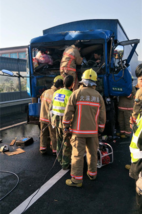 4月19日上午6點10分,寧向大溪出口正在進行分流,所有車輛正緩慢前行中,一輛贛F38***牌照的藍色大貨車顯然還沒有適應這分流的節奏,“砰”地一聲猛然撞上了前面的大貨車。 兩個“大家伙”碰撞的威力非同小可,直接的后果就是后車的車頭變形,損傷極大,貨車駕駛員被卡在車頭里出不來。 時間就是生命,施救中心迅速出動,配合交警、消防部門在現場進行預警,并協助進行事故處理。