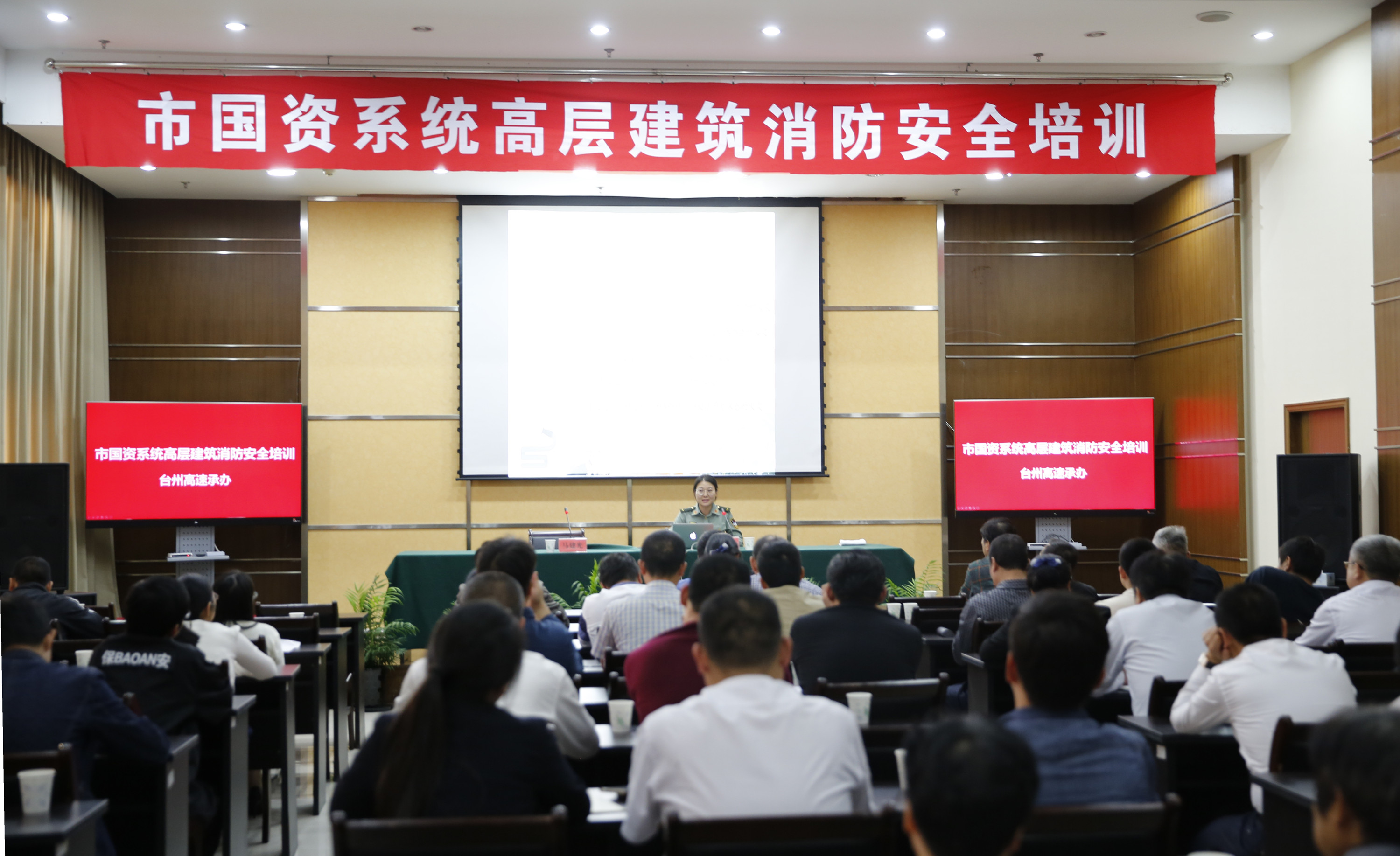 圖為培訓現場 本次高層建筑消防安全培訓邀請了臺州市開發區消防大隊消防安全教員金盼前來講授相關知識。金盼教員針對高層建筑特點,圍繞火災基礎知識、火災離我們并不遙遠、高層火災特點、火場如何逃生及單位如何自查自糾等方面,再通過案例和數據進行詳細的講解,使培訓內容具有很強的指導性和實用性。