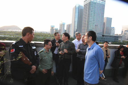 圖為演練前集團安全總監項同富介紹高層緩降逃生設備 培訓結束后,參會人員集體到集團大樓5樓外平臺觀摩高層緩降逃生演練。在演練中,2名模擬被困人員先后使用高層緩降逃生設備從16樓窗口平安緩降逃生到5樓平臺。之后通過演練和講評,大家進一步熟悉了高層緩降逃生設備及使用方法,拓展了高層建筑逃生思路。 陳科