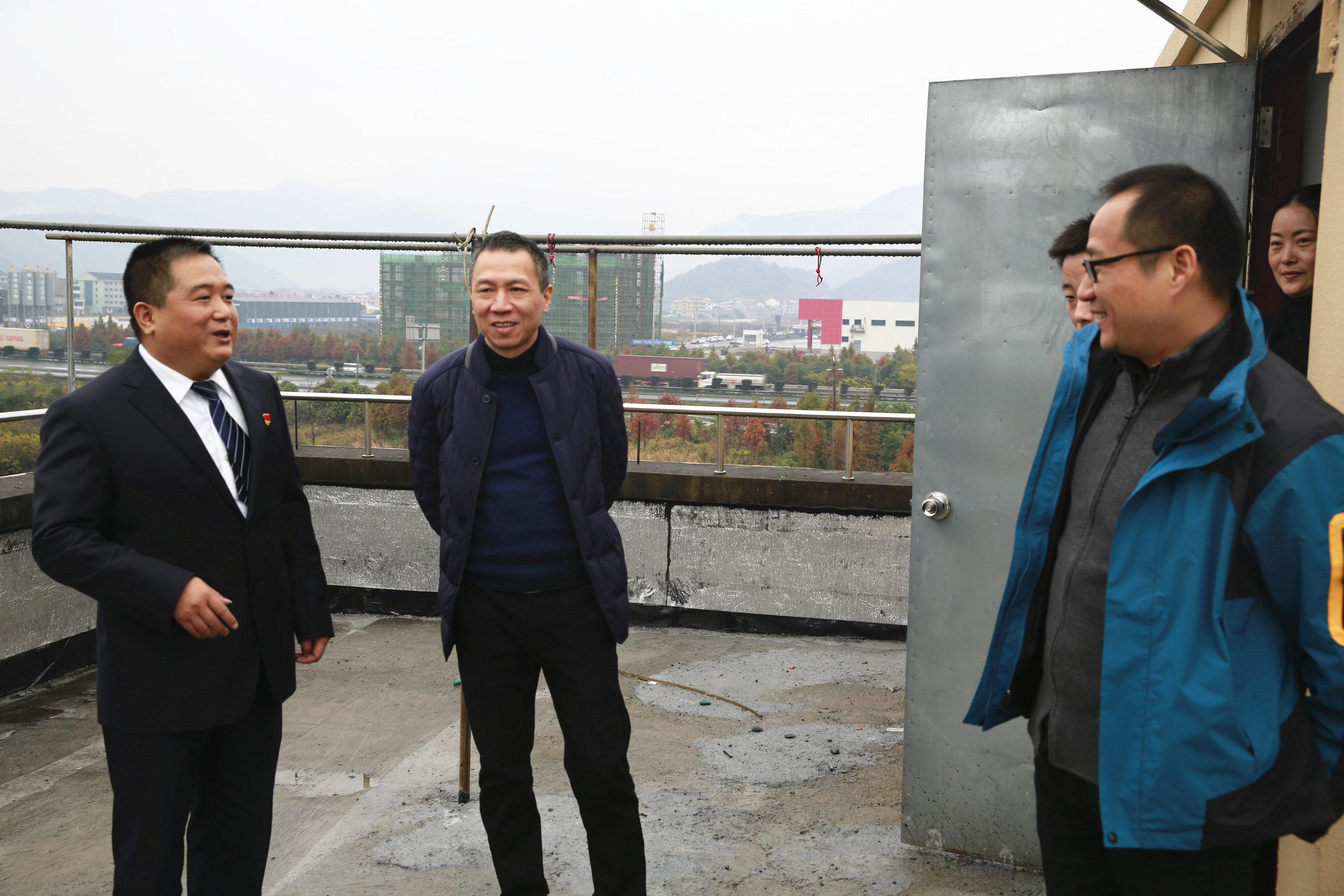圖為集團(tuán)副董事長(zhǎng)、總經(jīng)理張建平檢查臺(tái)州南收費(fèi)所陽(yáng)光房