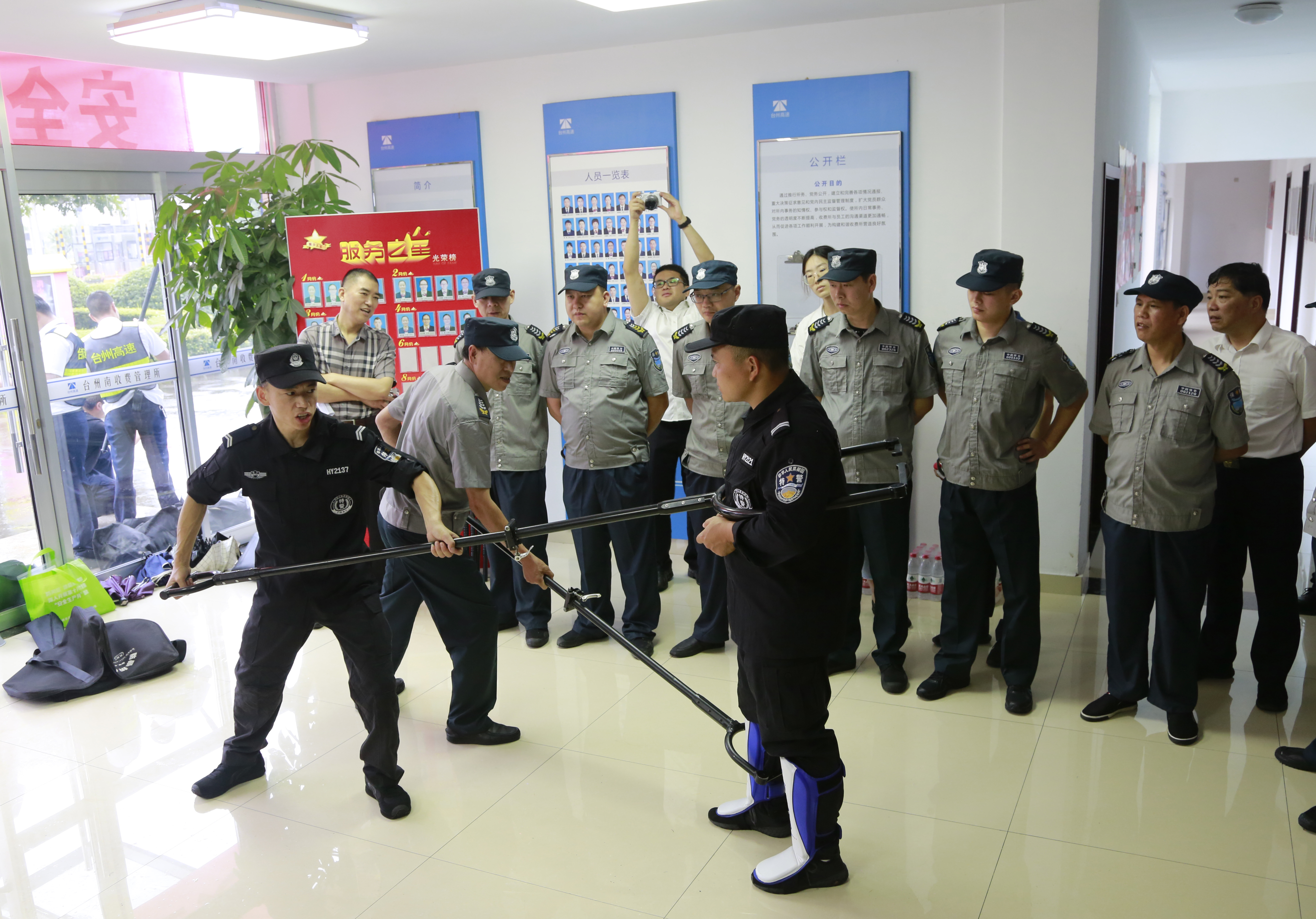 圖為物業人員現場練習器械使用 演練開始前,盧尚明對防爆盾牌、防爆鋼叉、抓捕器、警棍等各類防爆器材的功能和使用方法進行一一講解,并示范操作,以及帶領大樓浙師大印象物業人員現場練習器械使用。
