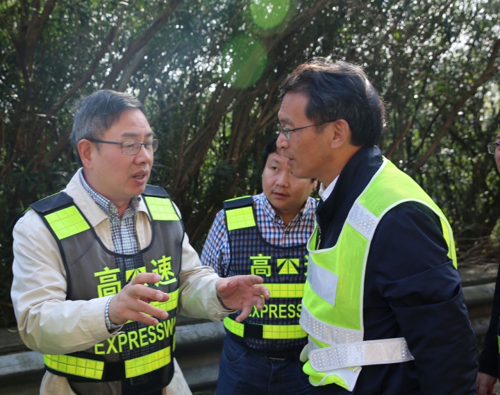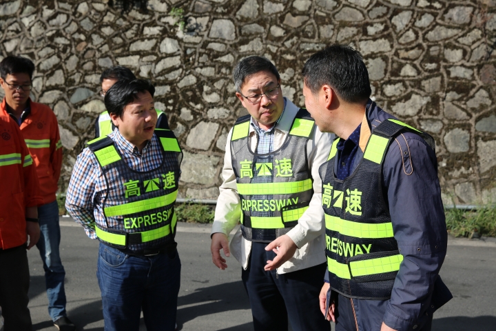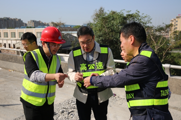 10月31日上午,臺州高速集團董事長陳文波在總工程師江輝的陪同下,趕赴甬臺溫高速公路溫州方向黃土嶺隧道、橋梁維修加固工程施工現場,檢查施工進展情況。
