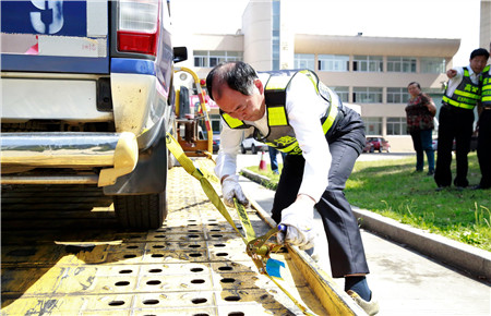 當哨聲響起時,清障作業(yè)的考試開始了。就象聽到路上事故的指令,選手們飛快躍上清障車,趕到“現(xiàn)場”,一組兩名員工,一名快速擺放隔離筒進行預警,一名趕到“事故車”前進行背拖拖曳作業(yè),綁帶作業(yè)、固定輪胎,甚至警燈、檔位、手剎、安全帶、巡視事故車等細節(jié)也有具體要求,雖然上午天氣涼爽,可因為比賽的速度比拼與現(xiàn)場緊張的氣氛,選手們額頭都冒出了熱氣。