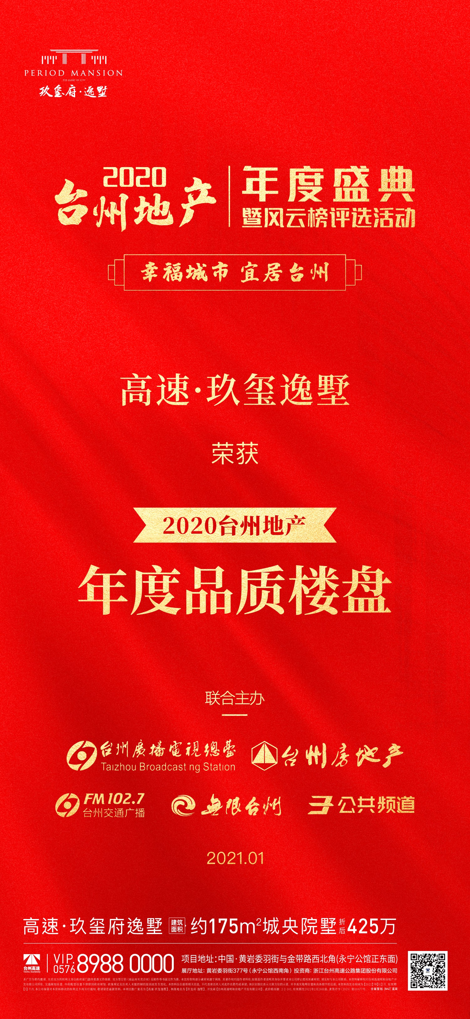 2021年1月19日下午,由臺州廣播電影電視集團聯(lián)合臺州市房地產(chǎn)業(yè)協(xié)會共同舉辦的2020臺州地產(chǎn)年度盛典暨臺州地產(chǎn)風云榜,在全城熱矚下重磅舉行。高速房產(chǎn)玖璽府·逸墅項目榮獲“2020臺州地產(chǎn)年度品質(zhì)樓盤”榮譽稱號。