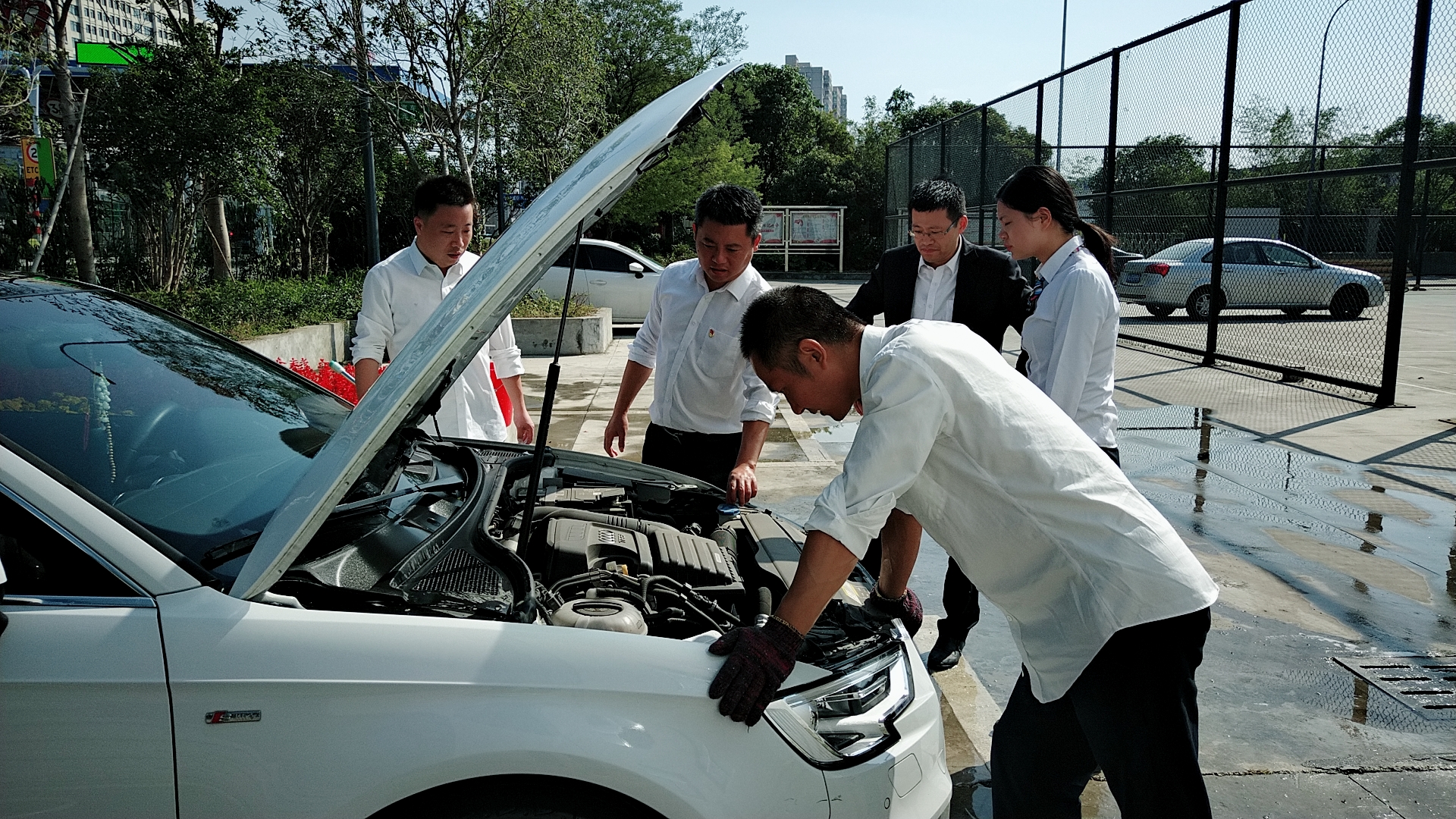 溫嶺西支部書記周超帶領(lǐng)黨員服務(wù)群眾 當(dāng)天上午,活動一開始,前來洗車的車輛絡(luò)繹不絕。在支部書記周超的帶領(lǐng)下,五名黨員便開始分工合作。兩名男同志負責(zé)沖水、上泡沫、擦洗、再沖水,兩名女同志負責(zé)擦干和吸塵器清掃內(nèi)室,還有一名男同志負責(zé)開車挪車,需要清洗的車輛一輛接著一輛,黨員同志們顧不得擦干身上的被水濺濕了的衣服,忙得不亦樂乎??粗幌吹靡粔m不染的車,大家都不約而同地會心一笑。