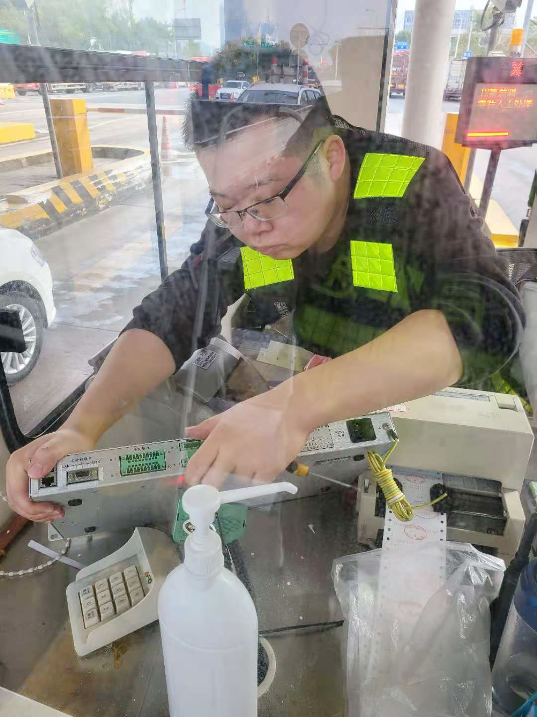 “咦,崗?fù)ぷ郎系倪@個扁長形設(shè)備哪里去了,忽然感覺桌面整潔了好多!”剛來交班的臺州收費所收費員李靜一臉疑惑,“拿掉了這個設(shè)備,ETC車輛還能正常通行嗎?” “不是拿掉了,是我們給它般了個‘新家’而已。”工程部機電設(shè)備維養(yǎng)中心陳華棟指了指安裝在桌面下方的設(shè)備。