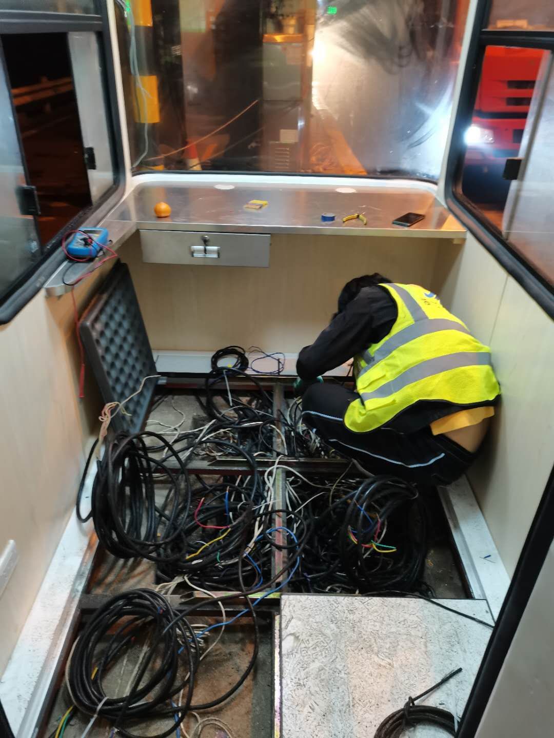 1月20日,公司董事長、總經理陳文波到收費所現場查看,要求加快速度抓緊搶修崗亭,重新安裝好各項設備設施,盡快開通車道。接到任務后,維養中心緊急召開會議討論,制定新崗亭安裝、設備調試方案。 21日下午4點左右,訂購的新崗亭和損壞的設備設施陸續到位,中心值班人員協同設備廠家一起將其安放并固定至車道原位置。因崗亭傾倒時拉斷了底下很多線纜,在拆除設備時又因為緊急搶修需要沒有作相應標注,現場各種電線接頭雜亂如麻。考慮到夜間查線、接線存在一定的安全隱患,也不利于施工,搶修人員決定第二天再戰。