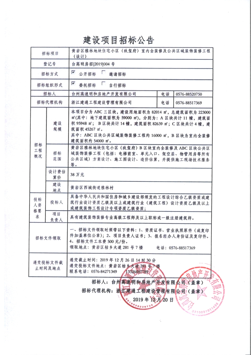 黃巖區(qū)雅林地塊住宅小區(qū)(玖璽府)室內全裝修及公共區(qū)域裝飾裝修工程招標公告