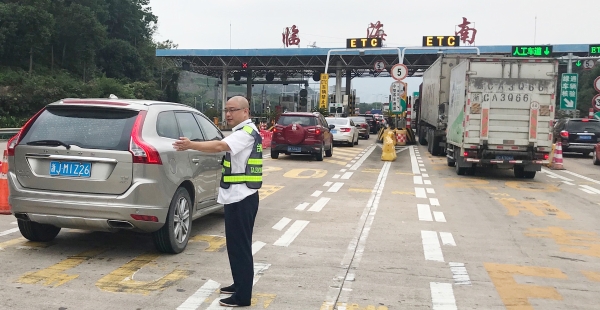 節(jié)日期間,車流量比往日多很多,每天多次出現(xiàn)長時間大分流,一遇上高峰期車輛源源不斷地從各個方向匯聚在此,容易造成內(nèi)外廣場堵車。臨海南收費所車輛雖多,但該站所出口秩序井然,未出現(xiàn)擁堵現(xiàn)象。瞧!這位在車流中,身著反光背心在這場大車流中,揮舞著雙臂指揮著交通,讓飛馳的車輛通過客貨分離,有效降低客貨車隨意串道,達到快速放行的是四班班長楊俊輝。