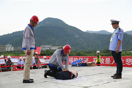 7月5日下午,根據“安全生產月”活動安排,內環路(黃巖段)四個標段的施工、監理單位分別派出代表隊,在內環北路(黃巖段)第四標段施工現場,依次開展消防、現場急救和意外窒息事故的應急救援演練。
